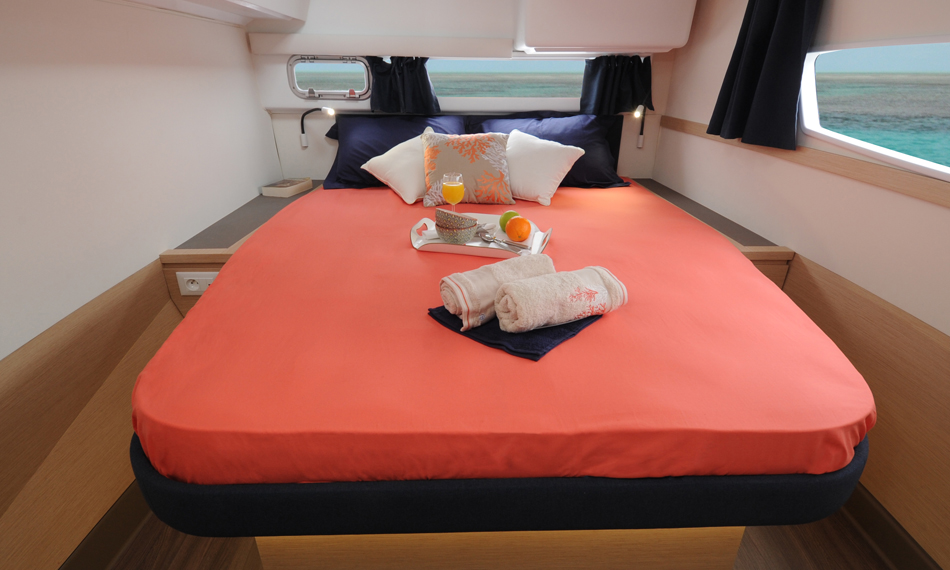 Alquiler de catamaranes Lagoon 400. Este catamarán consta de 4 camarotes dobles y dos cabinas individuales, además de salón convertible en cama doble.