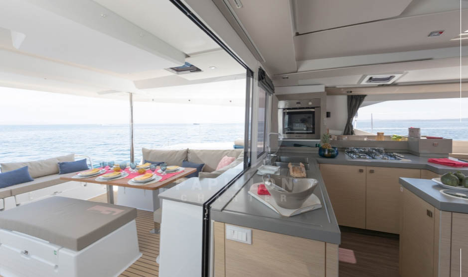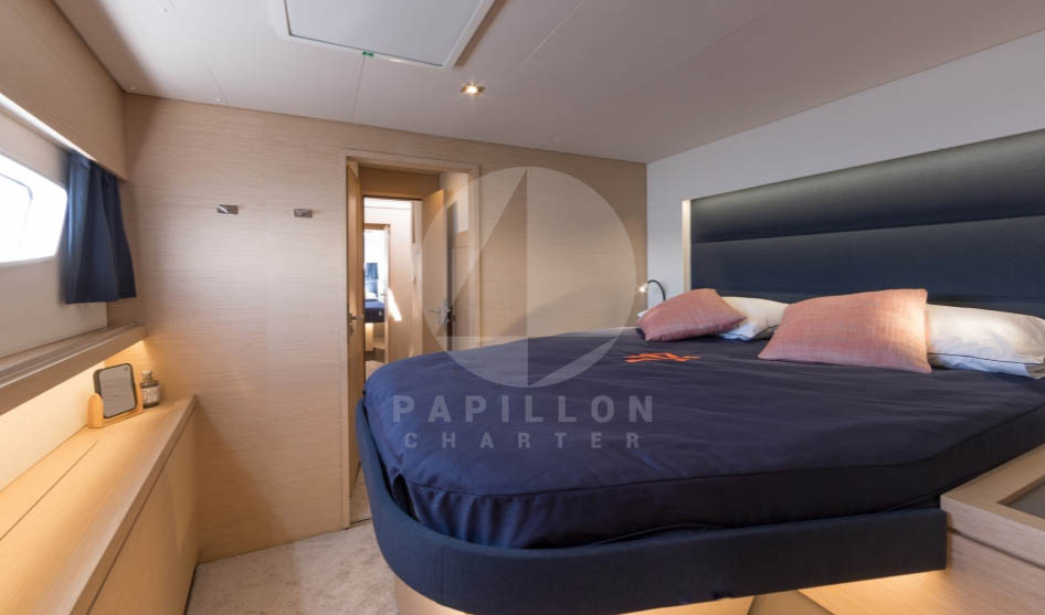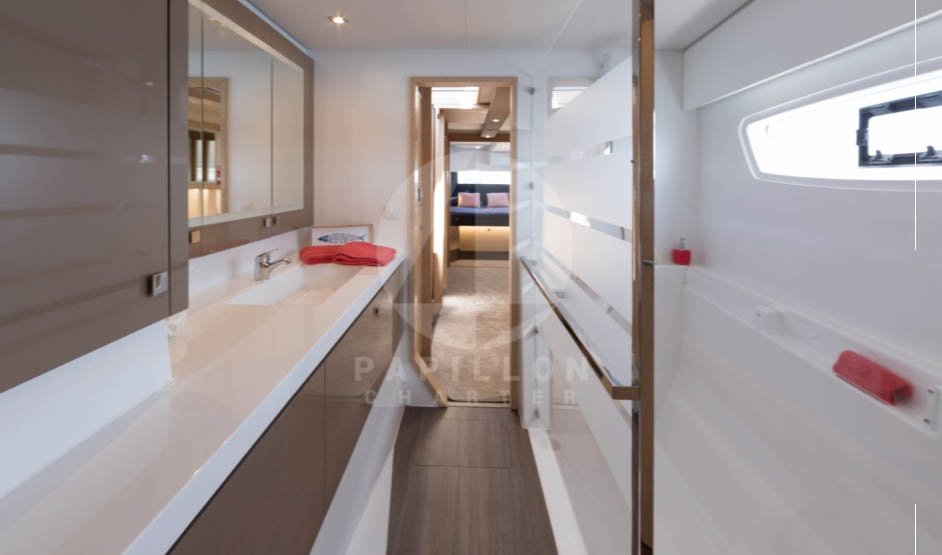 Dotado de 3 camarotes con baño individual de diseño italiano e inodoros eléctricos, uno de ellos suite, salón convertible extremadamente luminoso y acogedor, 6 aparatos de Aire acondicionado, individual en camarotes y salón, desalinizadora para no tener que ir a puerto para repostar agua dulce, generador para tener 220v de forma independiente, inverter 220v, 3 neveras, congelador, Horno de gas, microondas, cafetera, equipo de música bose con bluetooth, Tv en salón y camarote principal, equipos de snorkel, paddle surf y plataforma hidráulica.