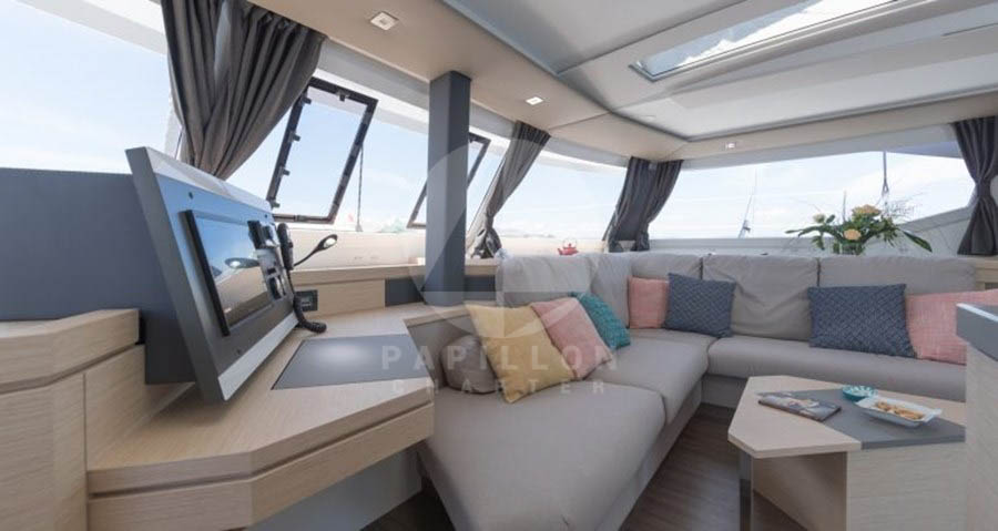 Incorpora un flybridge de 5,5m2, con una perfecta visibilidad en el puesto de mando y un gran solárium en la parte de popa y otro en proa que permite, tanto relajarse y disfrutar del sol como en espacio de juego para los más pequeños. La bañera, muy protegida del sol, comunica al mismo nivel con la cocina.