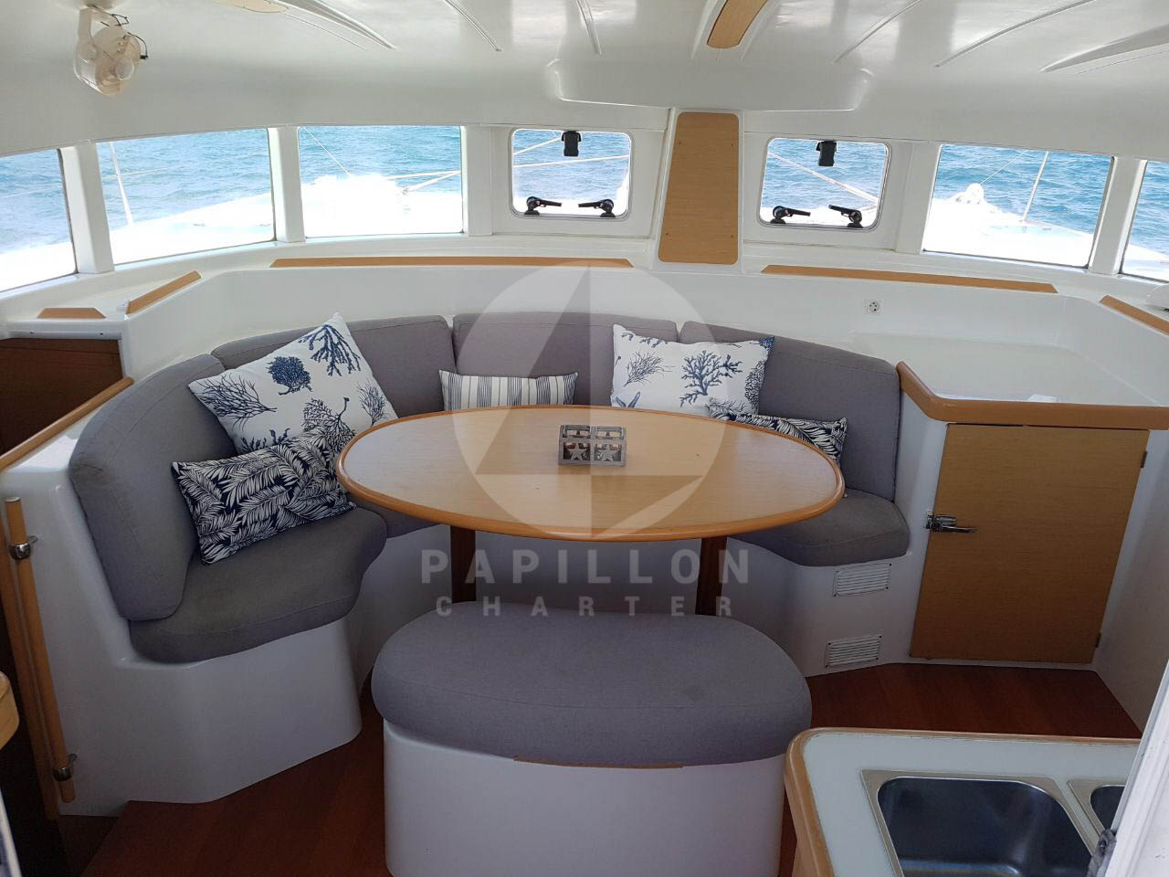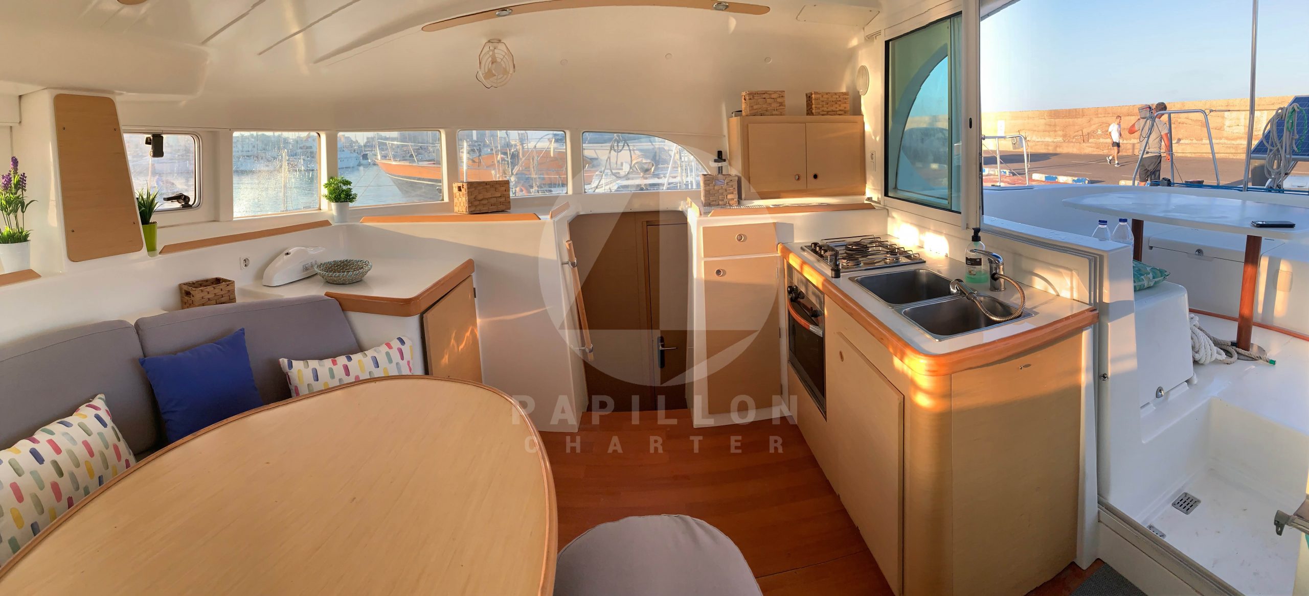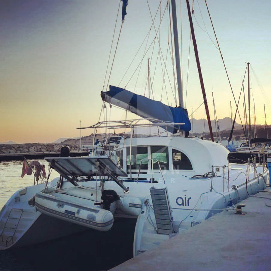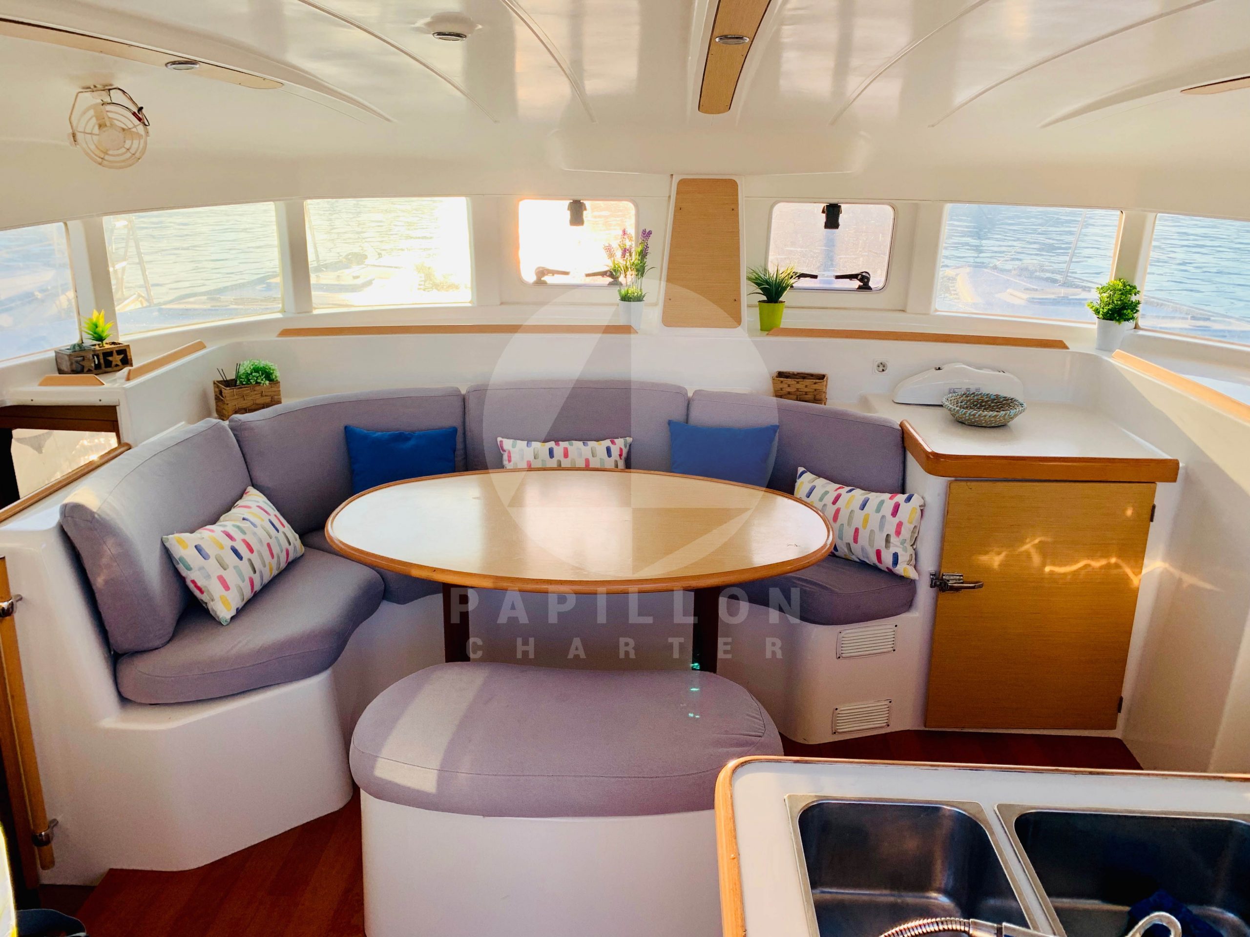 El catamarán Lagoon 400 S2 “Esmeralda” fabricado en 2017, con sus 12 metros de eslora y 7,25 metros de manga, cumple a la perfección todas las exigencias para pasar unas vacaciones de inolvidables. Acoge confortablemente a 8 personas en sus 4 camarotes dobles con baño individual más 2 personas en su salón convertible.