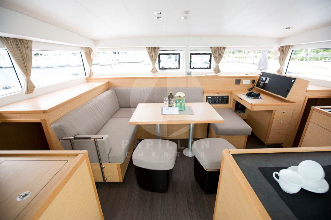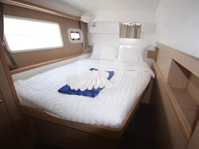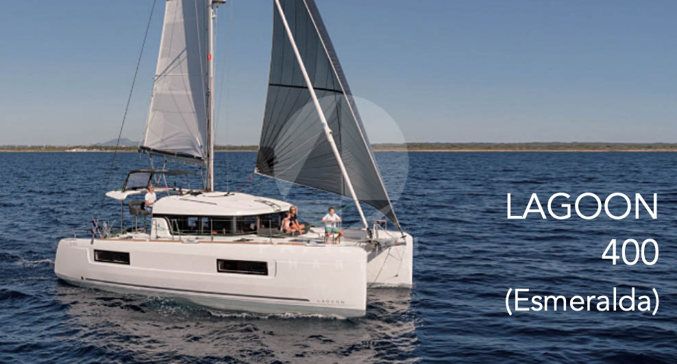 El catamarán Lagoon 400 S2 “Esmeralda” fabricado en 2017, con sus 12 metros de eslora y 7,25 metros de manga, cumple a la perfección todas las exigencias para pasar unas vacaciones de inolvidables. Acoge confortablemente a 8 personas en sus 4 camarotes dobles con baño individual más 2 personas en su salón convertible.