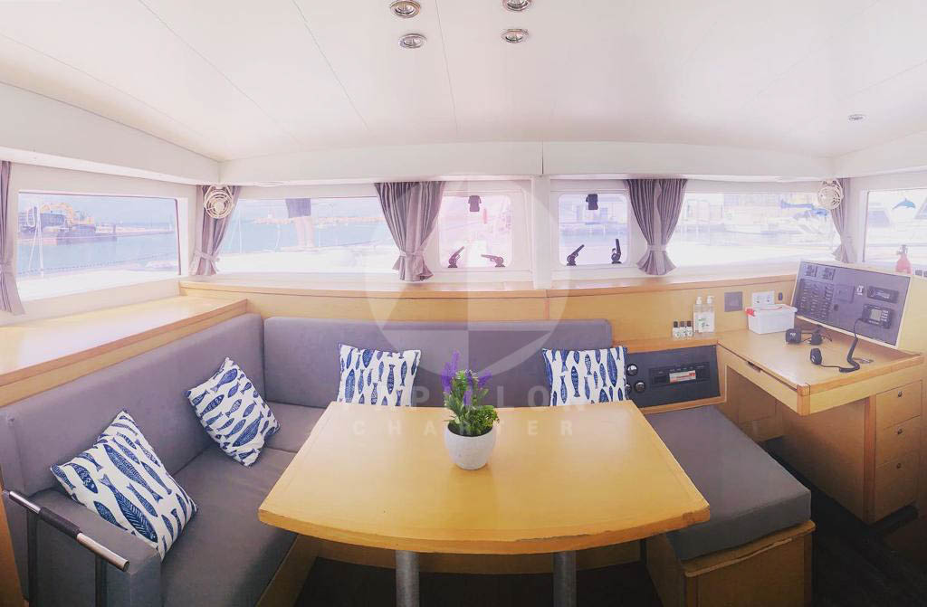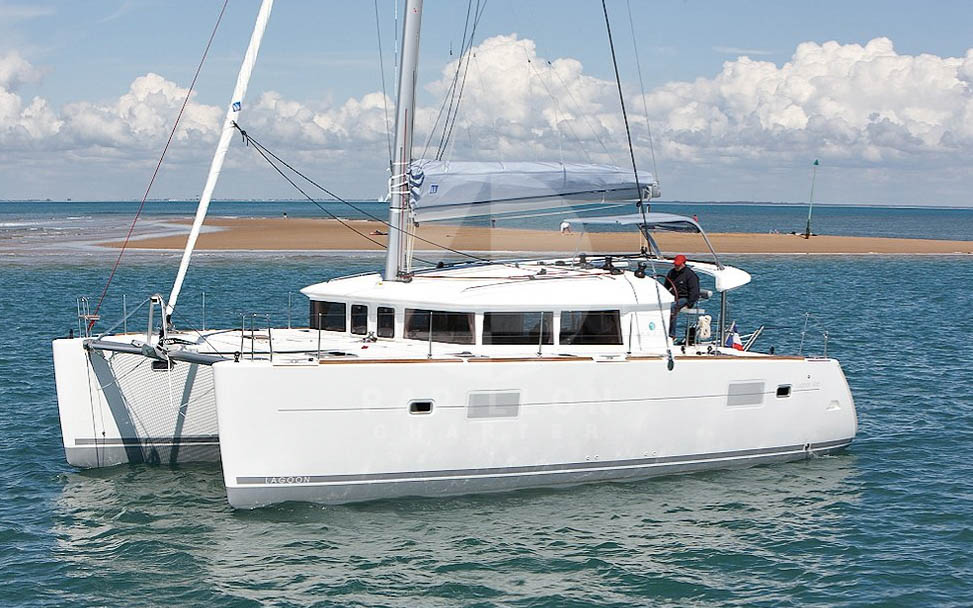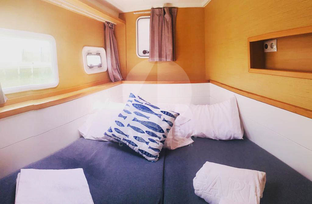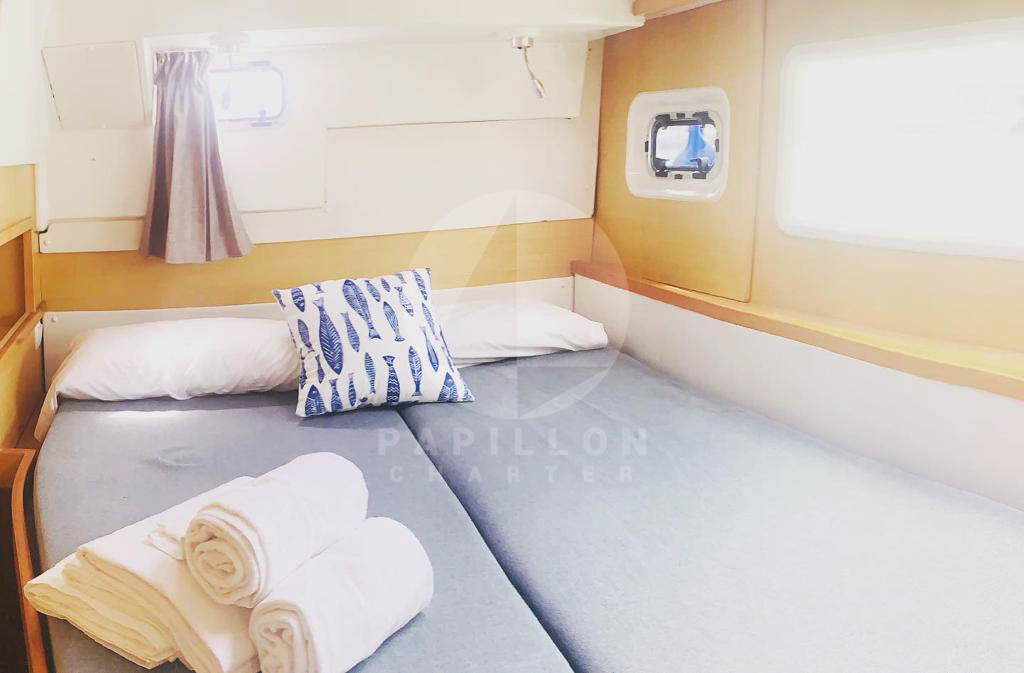 Nuestro catamaran Nora, Lagoon 400 S2, cuenta con 12 metros de eslora y 7,25 metros de manga, cumple a la perfección todas las exigencias para pasar unas vacaciones de inolvidables. Acoge confortablemente a 8 personas en sus 4 camarotes dobles con baño individual más 2 personas en su salón convertible.